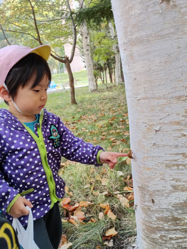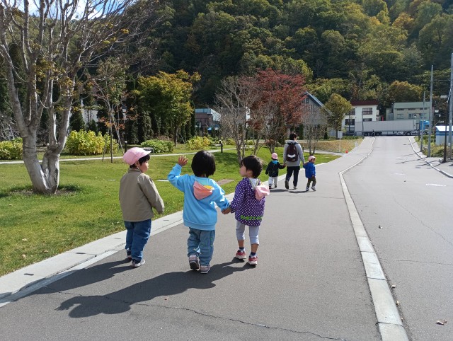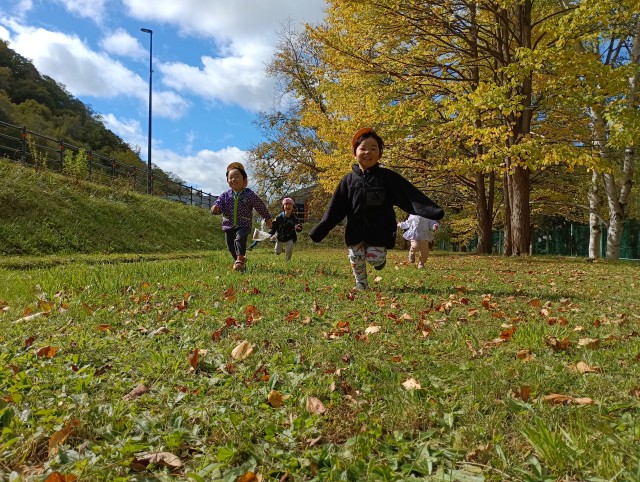 山が緑から黄色に色づき始め、子どもたちもその変化に気づき、落ち葉を拾ったり、バッタを探したり、友達や保育士との会話を楽しみながらお散歩しています