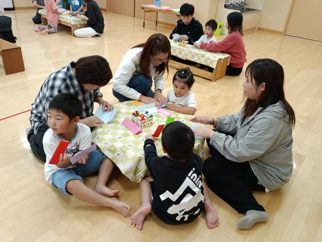 そのあとは、おりがみで「ビュンビュンゴマ」を作ったり、くまぐみさんで遊んでいる、ダンシングおにごっこ(しっぽ取り)を親子で楽しみました。