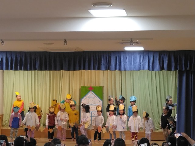 お話しは、”牛乳パック}”や”カップ”等を利用して作った人形で「3匹のこぶた」と