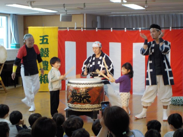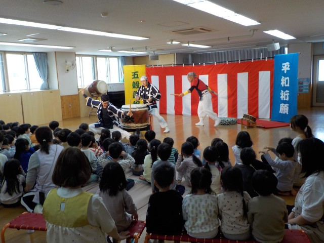 和太鼓の迫力と響く音に怖がる姿もありましたが「かっこいい」「やってみたい」と目を輝かせる子どもたち。実際に太鼓を打つ場面もあり、嬉しそうに参加していました。