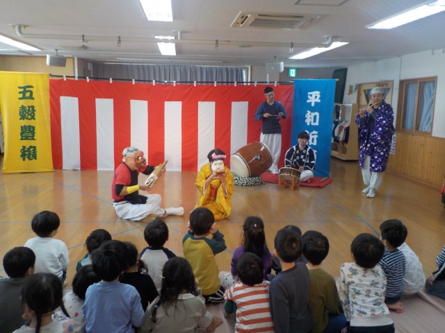 今年度2回目の父母の会による公演は「乱拍子」さんが来てくれました。345歳児クラスのお友だちは「和太鼓」や「わらべ唄」「大道芸」を見せていただきました。