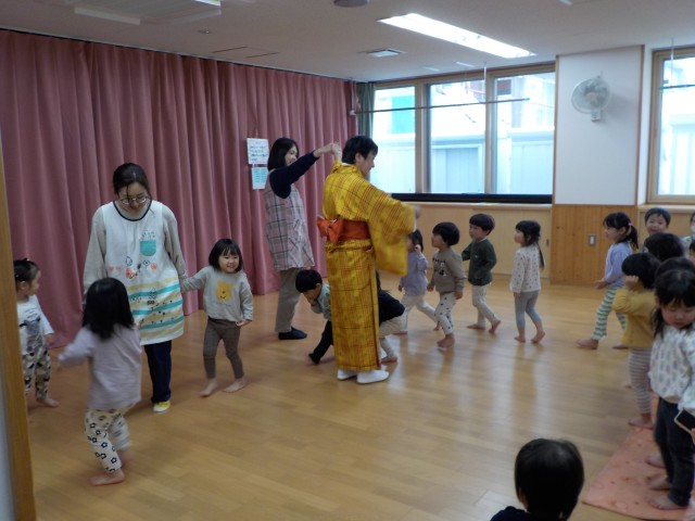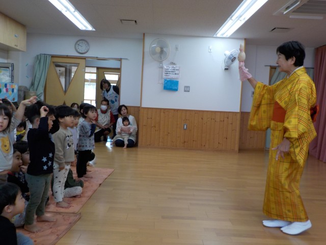 今年度2回目の父母の会による公演は「乱拍子」さんが来てくれました。012歳児クラスのお友だちは「わらべ唄」を楽しみました。