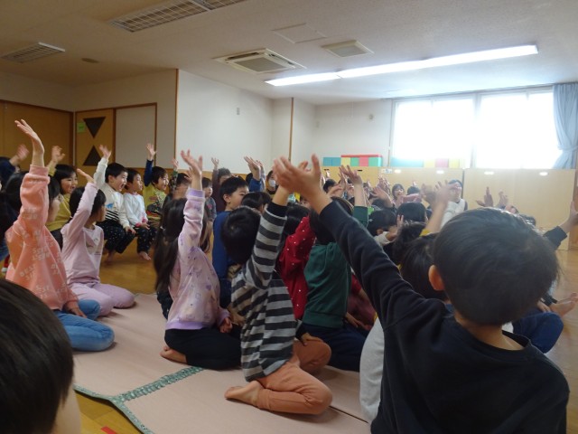 「おひさま」というお話を見ました。大型しかけ絵本を舞台に物語がすすんでいき「おひさまを取ってみたい」と願うゆう君とチコちゃんの楽しく温かい冒険に、子どもたちもくぎ付けでした♫