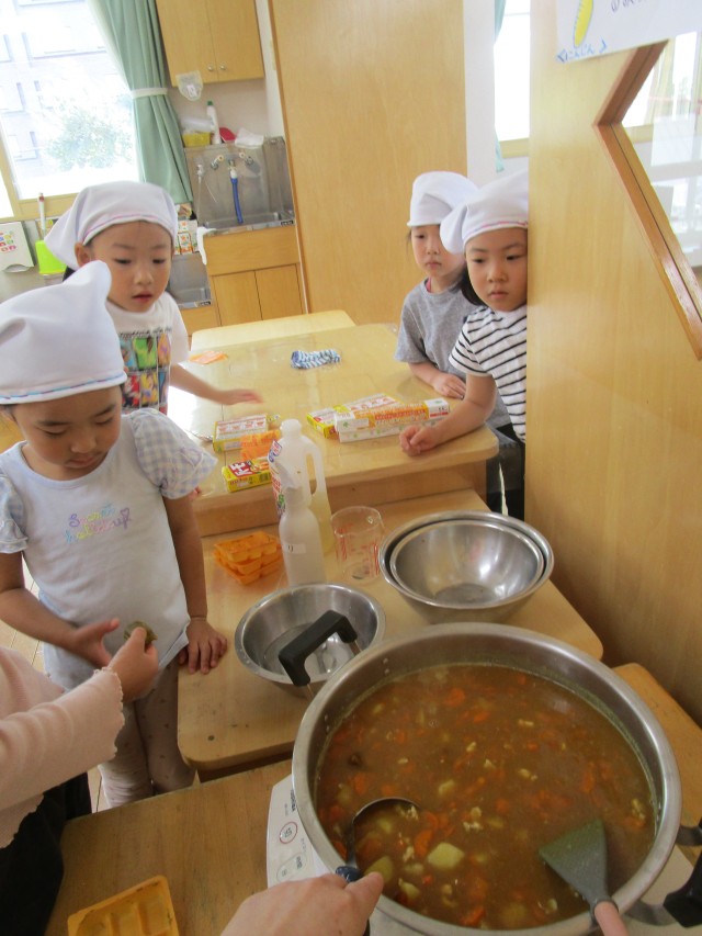 年長あか組さんが、自分たちで育てた「じゃがいも」と「たまねぎ」を使って、カレーライス作りに挑戦しました。