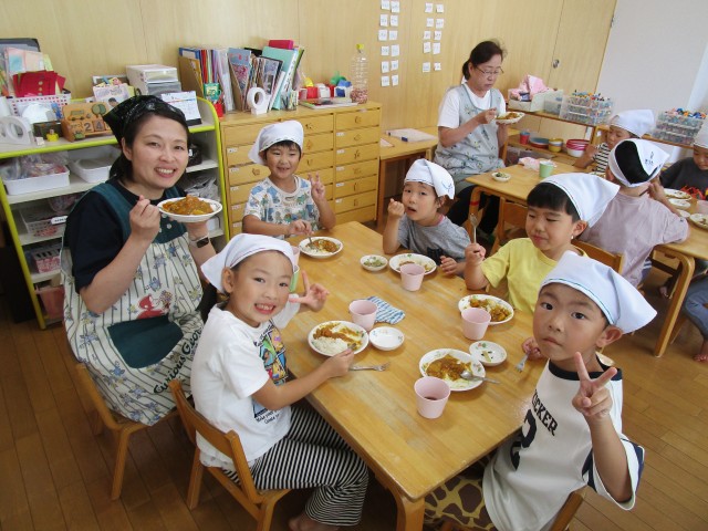 その日の給食は夏野菜カレーで、お集まりを思い出しながらモリモリ食べていました♪